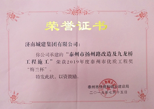 泰州市揚州路及九龍橋工程施工被評為2019年度泰州市優(yōu)質工程獎”梅蘭杯“