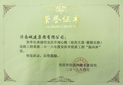 安慶市湖心路(迎賓大道-菱湖北路)道路工程被評(píng)為2018年度安慶市優(yōu)質(zhì)工程“振風(fēng)杯”獎(jiǎng)