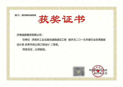 濟(jì)南市工業(yè)北路快速路建設(shè)工程被評為2019年度行業(yè)優(yōu)秀勘察設(shè)計(jì)獎優(yōu)秀市政公用工程設(shè)計(jì)二等獎