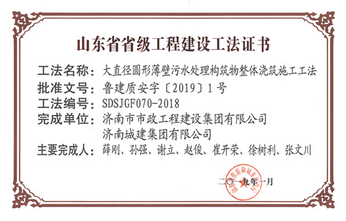 集團“大直徑圓形薄壁污水處理構(gòu)筑物整體澆筑施工工法”被評為山東省省級工程建設(shè)工法
