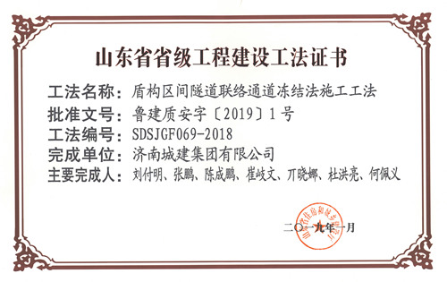 集團(tuán)“盾構(gòu)區(qū)間隧道聯(lián)絡(luò)通道凍結(jié)法施工工法”被評為山東省省級工程建設(shè)工法