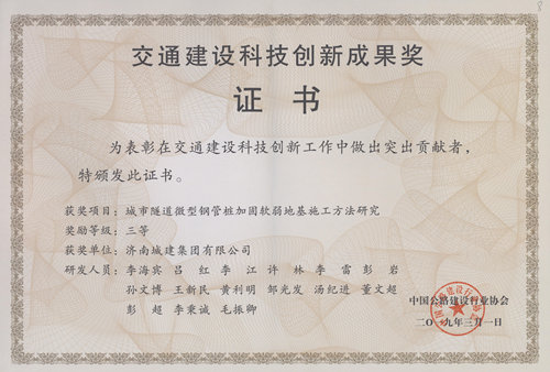 集團《城市隧道微型鋼管樁加固軟弱地基施工方法研究》榮獲“交通建設(shè)科技創(chuàng)新成果獎三等獎”