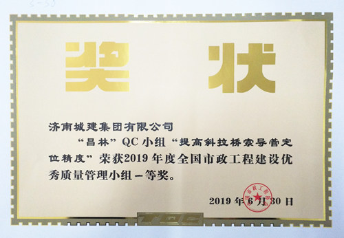 集團“昌林”QC小組《提高斜拉橋索導(dǎo)管定位精度》榮獲“2019年度全國市政工程建設(shè)優(yōu)秀質(zhì)量管理小組一等獎”