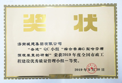 集團(tuán)“奮進(jìn)”QC小《綜合管廊C型哈芬槽預(yù)埋裝置的研制》榮獲“2019年度全國(guó)市政工程建設(shè)優(yōu)秀質(zhì)量管理小組一等獎(jiǎng)”