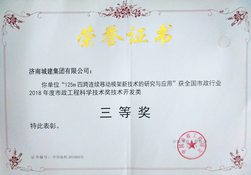 集團(tuán)《125m四跨連續(xù)移動(dòng)模架新技術(shù)的研究與應(yīng)用》榮獲“2018年度市政工程科學(xué)技術(shù)獎(jiǎng)技術(shù)開(kāi)發(fā)類三等獎(jiǎng)”