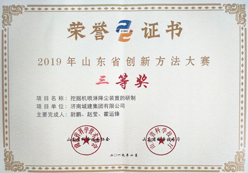 集團(tuán)《挖掘機(jī)噴淋降塵裝置的研制》榮獲“2019年度山東省創(chuàng)新方法大賽三等獎(jiǎng)”